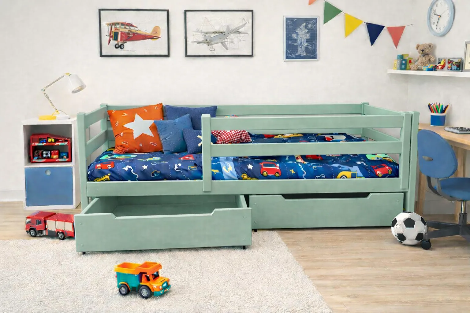 Łóżko dziecięce CZAREK Premium to pojedyncze łóżko z wysokimi frontami i barierką, które zapewni bezpieczeństwo zarówno w dzień, jak i w nocy.