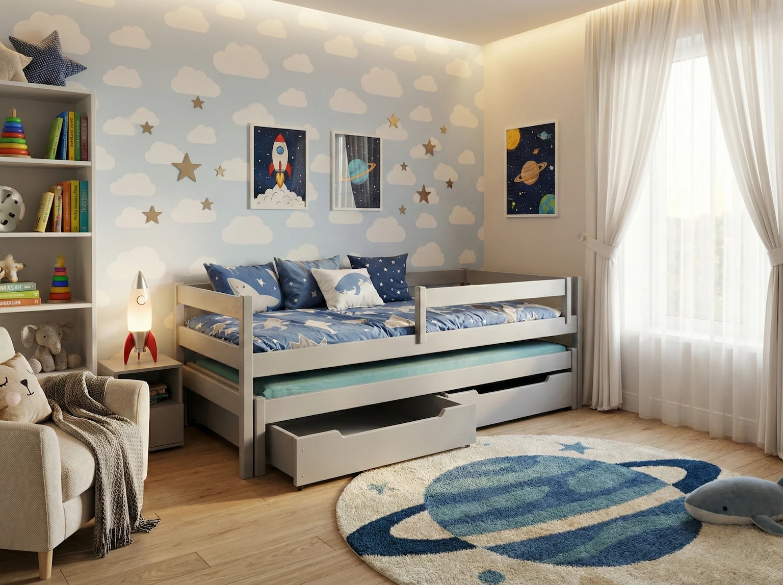 Nasze łóżka wyróżniają się nie tylko doskonałym wykończeniem, lecz także innowacyjną, mobilną barierką zabezpieczającą dzieci podczas snu.