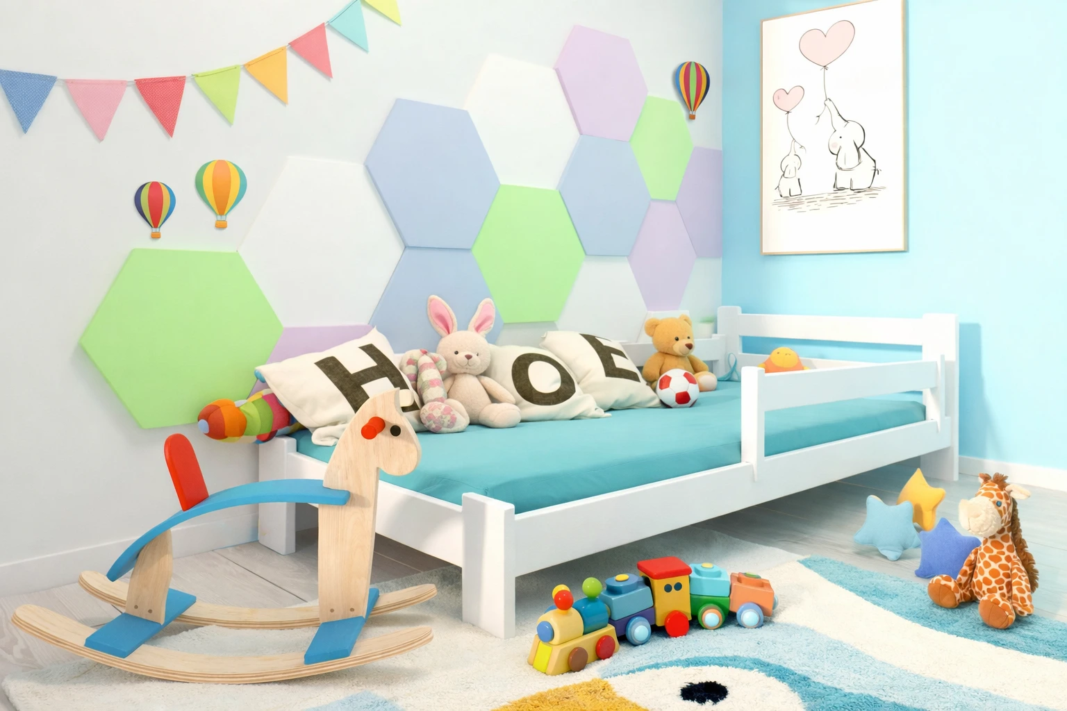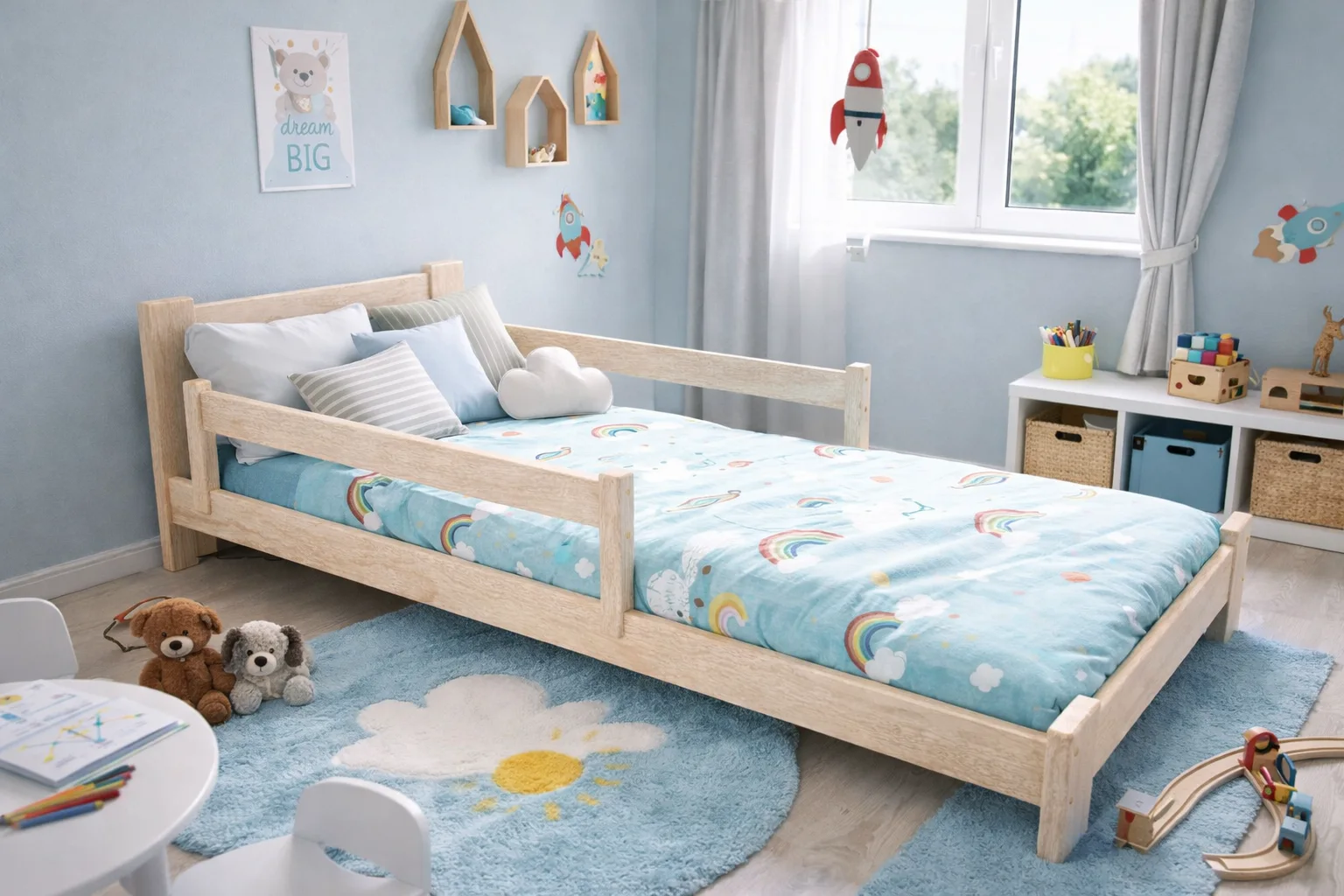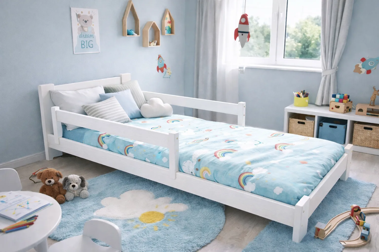 Nasze łóżka wyróżniają się nie tylko doskonałym wykończeniem, lecz także innowacyjną, mobilną barierką zabezpieczającą dzieci podczas snu.