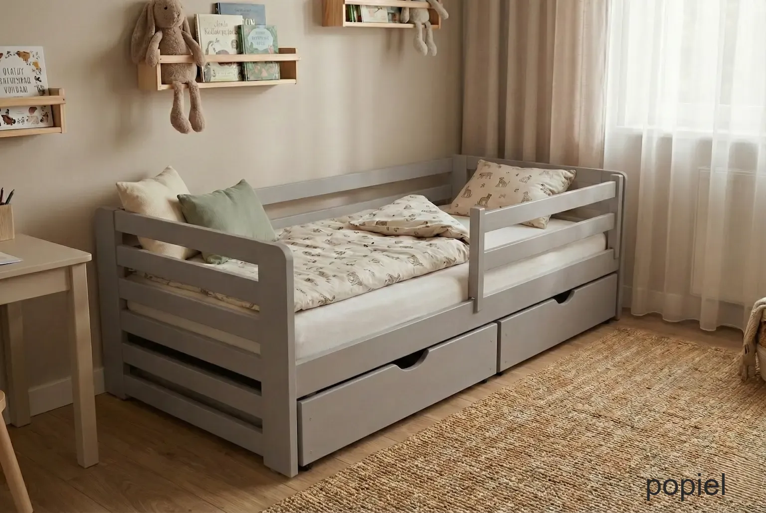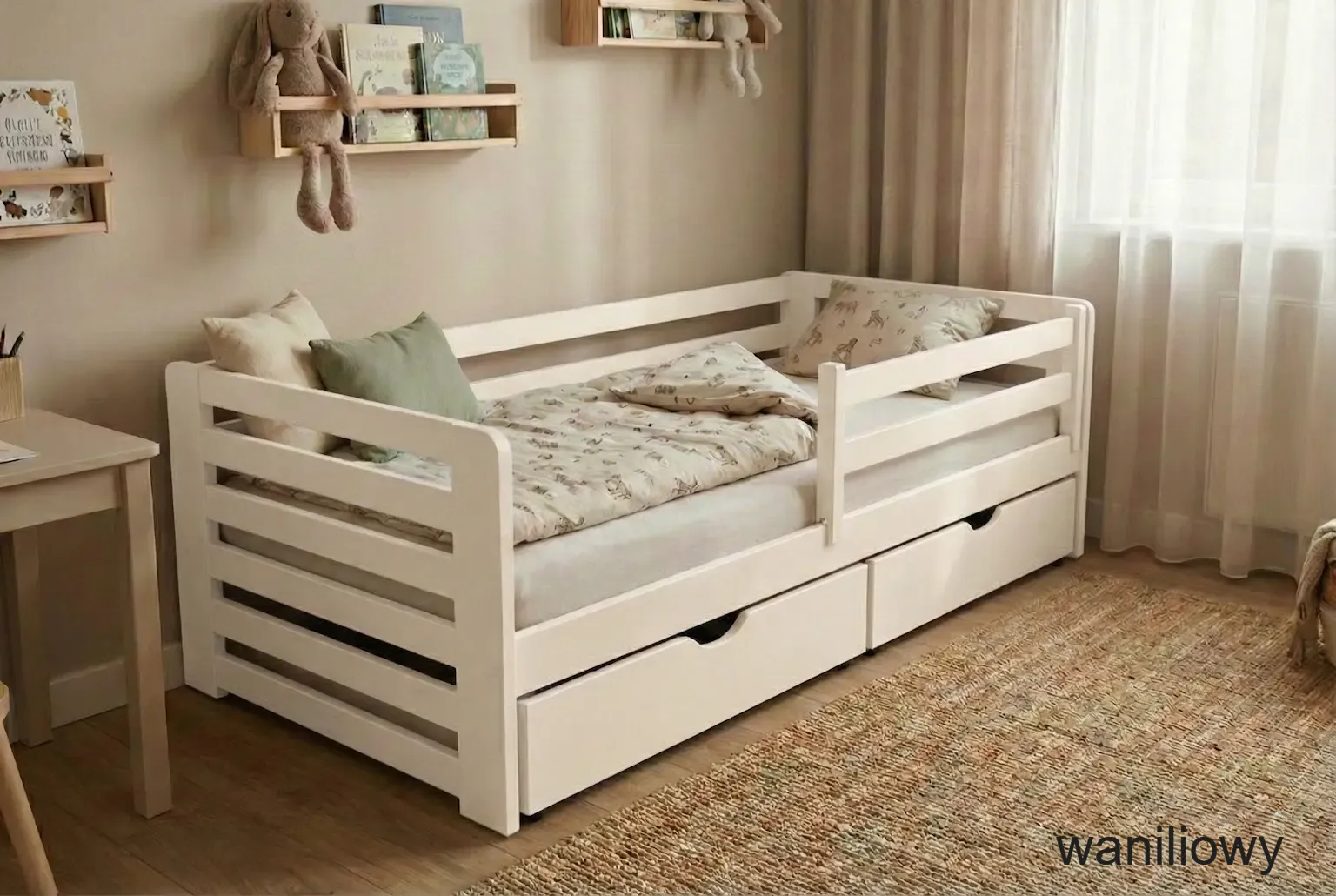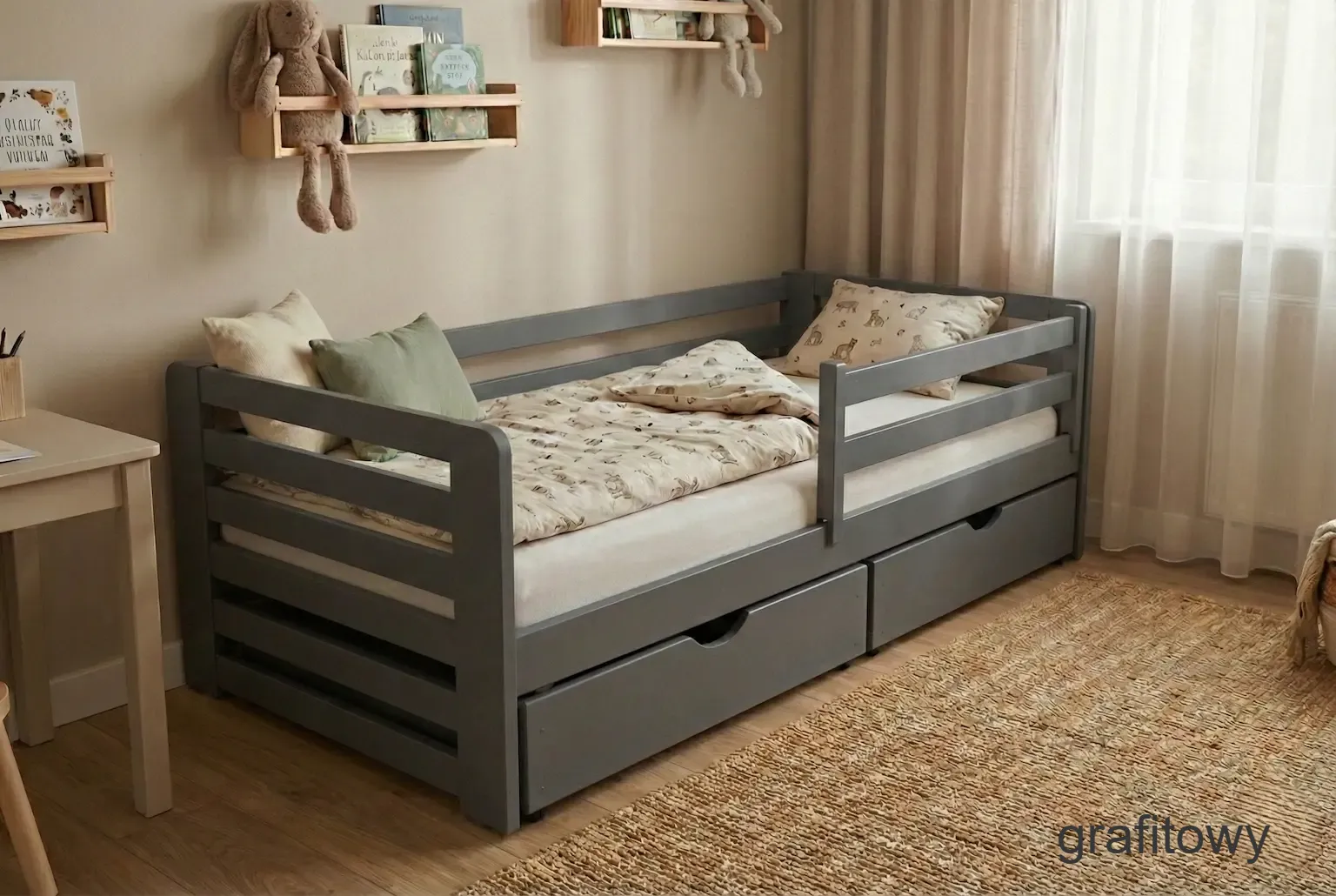 Nasze łóżka wyróżniają się nie tylko doskonałym wykończeniem, lecz także innowacyjną, mobilną barierką zabezpieczającą dzieci podczas snu.