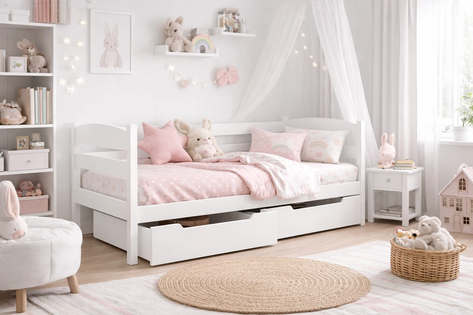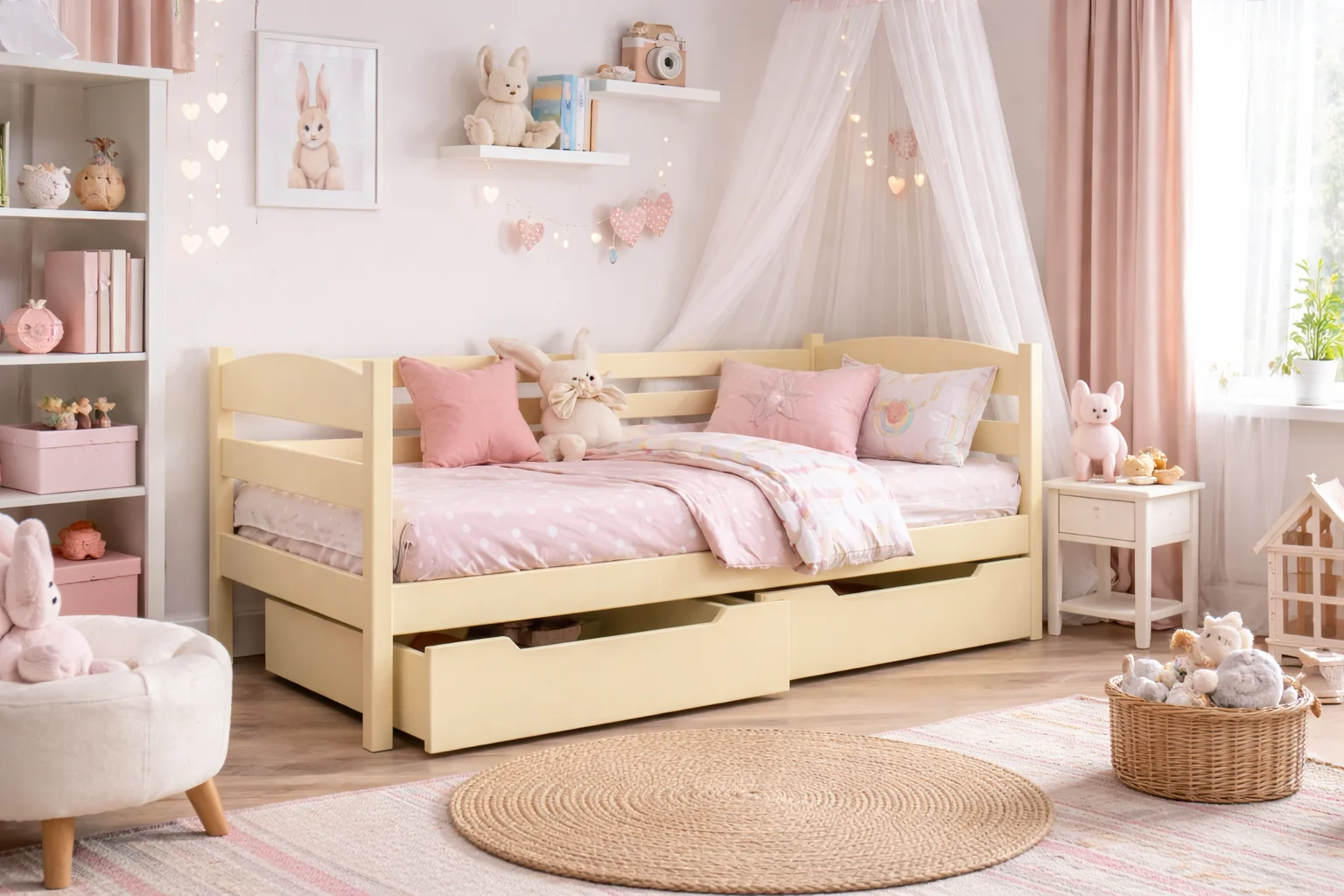 Stelaż z litego drewna sprawia, że nasze łóżka charakteryzują się imponującą wytrzymałością do 150 kg. Zapewnia to nie tylko komfortowy sen, ale także bezpieczne i stabilne miejsce, gdzie dzieci mogą bez obaw cieszyć się swoim czasem w trakcie zabawy czy odpoczynku.