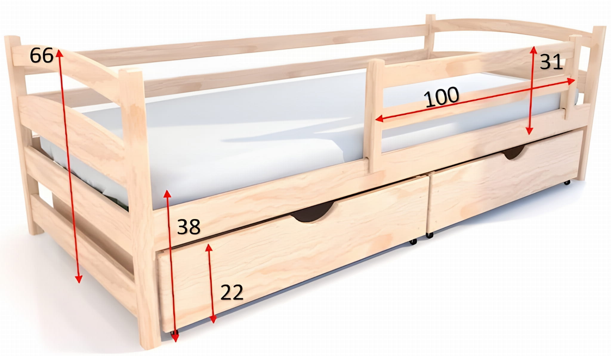 - Wysokość spania (z materacem 10 cm): 38 cm