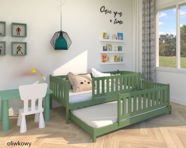 Tutaj wybierasz łóżko wysuwane Hania Low Premium w kolorze oliwkowym – idealne rozwiązanie dla najmłodszych użytkowników, które łączy bezpieczeństwo, wygodę i nowoczesny design. Obniżona wysokość spania sprawia, że łóżko jest doskonałe dla dzieci, zapewniając łatwy dostęp i większe poczucie bezpieczeństwa.