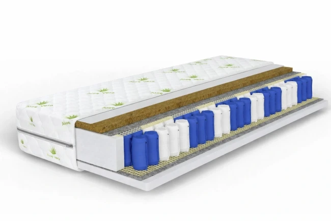 Materac Kieszeniowo-Kokosowy to innowacyjne połączenie 9-strefowego systemu sprężyn kieszeniowych z warstwą naturalnej maty kokosowej.