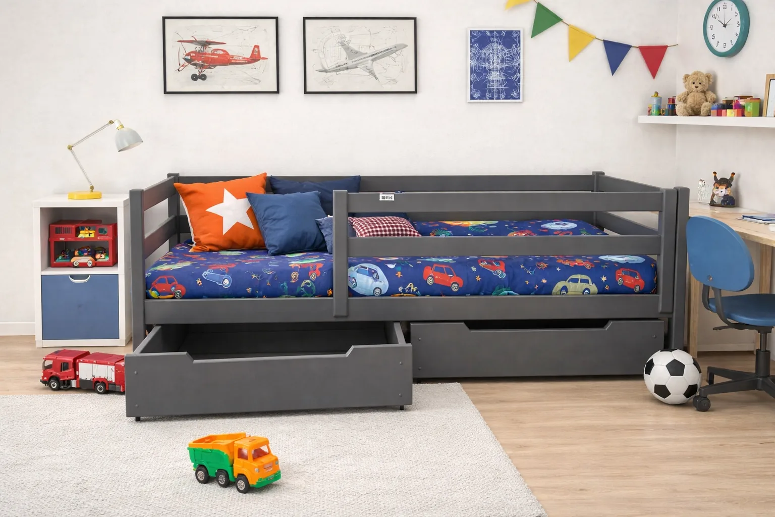 Łóżko dziecięce CZAREK Premium to pojedyncze łóżko z wysokimi frontami i barierką, które zapewni bezpieczeństwo zarówno w dzień, jak i w nocy.