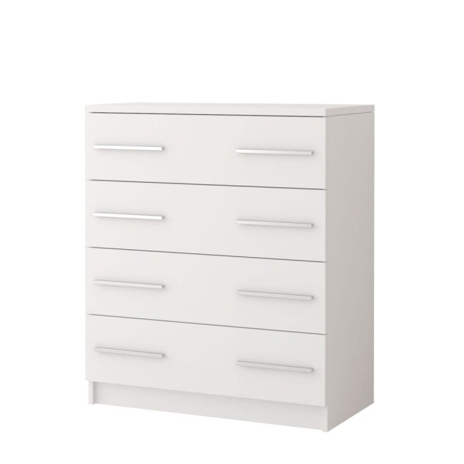 Nowoczesna biała komoda z 4 szufladami to doskonałe rozwiązanie do pokoju dziecięcego lub młodzieżowego. Jasna kolorystyka i prosty kształt to świetne rozwiązaniem zarówno do małych pokoi w bloku jak i dużych pomieszczeń domu jednorodzinnym. Ciekawa forma uchwytów jest doskonałym uzupełnieniem stylistyki tej kolekcji.
