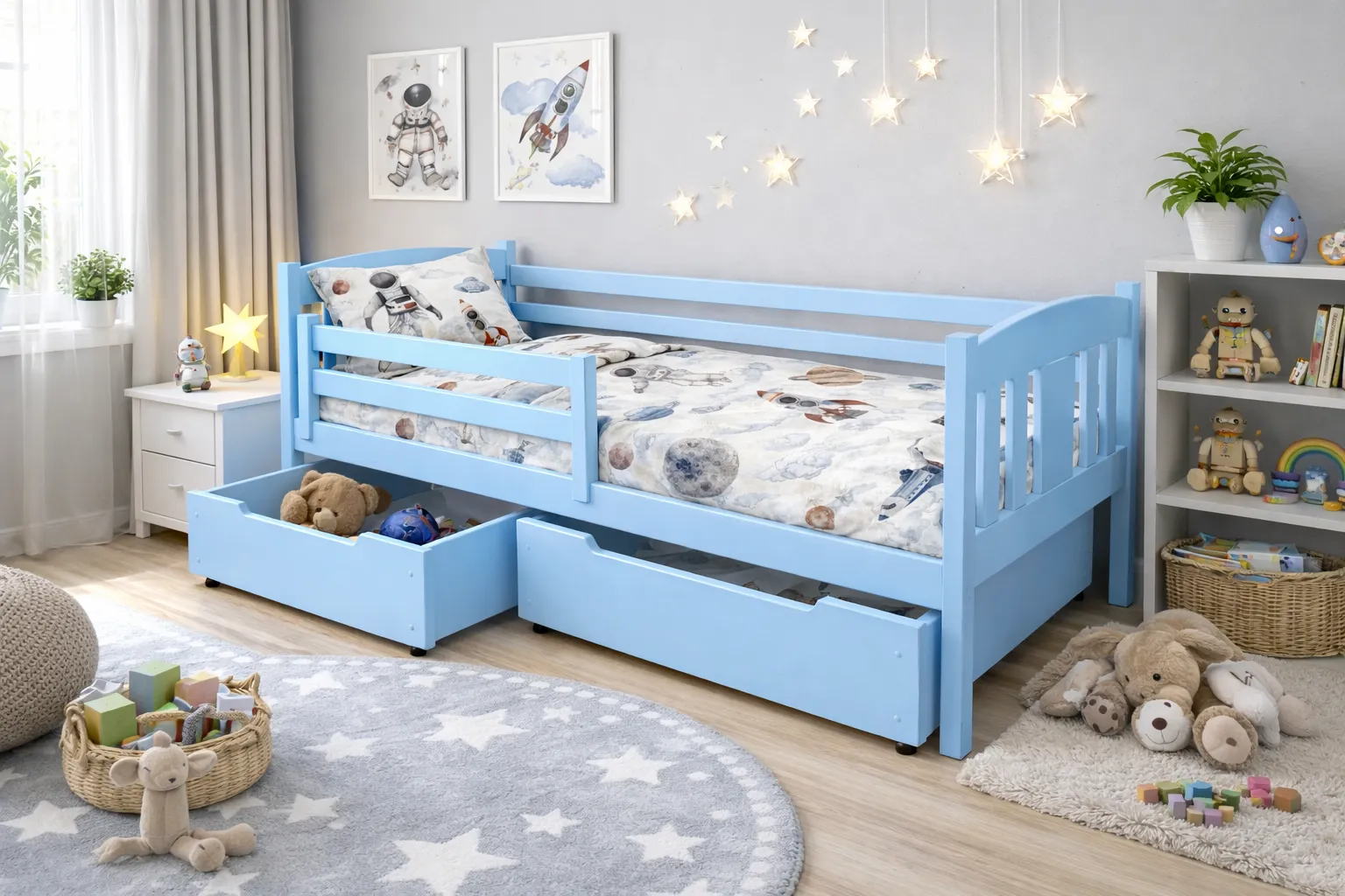 Jednym z walorów naszych łóżek jest również mobilna barierka zabezpieczająca dzieci w czasie snu.