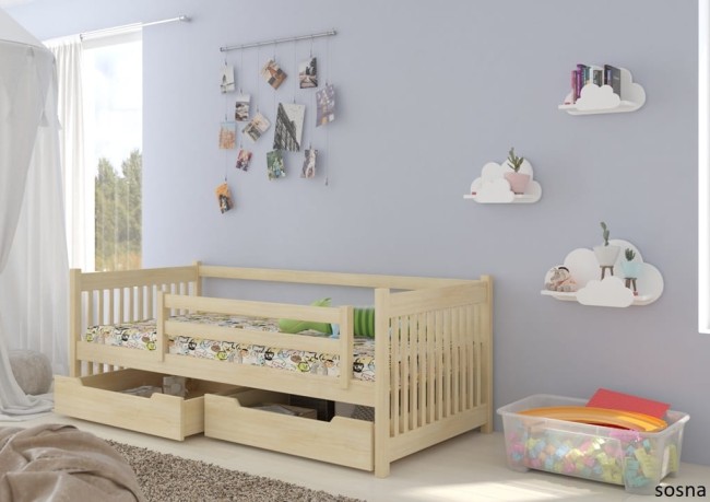 Wysokie fronty z pionowymi szczebelkami mają cechy pierwszego łóżeczka niemowlęcego, a otwarty bok z mobilną barierką daje już dużo więcej swobody rosnącemu szkrabowi, jednocześnie dbając o jego bezpieczeństwo.