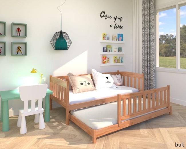 Wybór koloru buk nadaje łóżku naturalny, ciepły wygląd, który doskonale wpasuje się w różne aranżacje pokoju dziecięcego. Kolor bukowy tworzy przyjazną, ciepłą atmosferę, a jego uniwersalność sprawia, że pasuje do wielu stylów dekoracji.